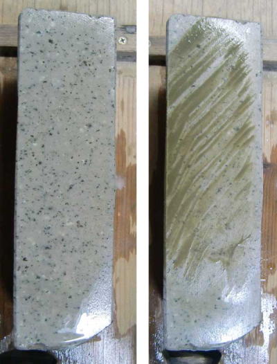 砥石いろいろ ![]() 天然仕上げ砥石の表面写真です 画像提供:ミクロワールドサービス / 砥石コーナー これまで砥石の表面を拡大撮影されたものを いろいろと見てきましたが このように立体的に撮影されたものには 初めてお目にかかりました 感動的な写真です やはりその道のプロの技は凄いものです 撮影をされた方の話によると、この砥石は 「亀印」と書かれた台に貼付けられたものだそうで 使用途中に剥離した薄片の一部だということです 柔らかめで、泥の出方や肌の感じが京都産のものに 良く似ているということです ![]() これは天然仕上げ砥石、京都・大平産の内曇です 黒い洞穴のように見えるものは巣板の巣だと思われます ![]() そしてこれは中砥の丹波産・青砥 上の画像とは同じ倍率で拡大されているものだそうです 中砥ですから、上の内曇よりは荒い粒子が観察できます ![]() これは荒砥の大村砥です オンザロックのグラスの中を覗いているようです・・ 水晶の結晶のようにも見えます それにしても、拡大されたものはどの砥石も美しい・・ ![]() 兵庫県但馬たじま地方で採れる 但馬砥を手に入れました 長さ21cm、巾6cm、厚み7.5cm ![]() このようなラベルが貼られています 但馬砥は一時途絶えていたということですが 最近また掘られているようで、専門店や京都東寺の 弘法市で売られているのを見かけます また、 ネット上でも売られているようです ![]() 早速鉋カンナ刃を研いでみました ご覧のようによく反応します ![]() 粒度は1500ほどで、細かめの中砥の部類に入ります 傷が浅いので画像をご覧のようにやや輝きが出ています 所々粗めの筋が入っていますが、これも浅いものです ![]() 上の状態から左半分だけ いつも使っているシャプトン刃の黒幕の 1500で研いでみました 傷は右側の但馬砥よりも荒い感じです また、傷が深いので右側よりも黒く見えます ![]() この鉋の鋼(はがね)は超特殊鋼(燕鋼)のものですが 強靭な鋼も軽く研ぎ上がります この前段階で使った砥石は、シャプトン・刃の黒幕1000です 上の画像はその研ぎ汁を付けて研いだものです こうするとよく反応し、強い研磨力が得られます シャプトン・刃の黒幕1500よりも傷ははるかに浅く 次の仕上げ研ぎがたいへん楽です ![]() これはハイス全鋼の鉋刃です 傷が浅いので、荒い仕事でしたらこの状態で充分使えます これも上の超特殊鋼と同様に研いだものです ハイス全鋼の刃は、シャプトン刃の黒幕でも 砥石のかかりが悪いのですが、但馬砥+「黒幕研ぎ汁」で研ぐと 短時間で力強く研ぎ上げることができます 砥石の底力も充分で、研ぎ心地もすばらしいものがあります これには驚いてしまいます また、この但馬砥の傷は 後の仕上げ砥のかかりにも影響が及ぶのです 参照 2009年12月、新たに但馬砥を入手 参照 研ぎの動画はこちら ![]() 50年以上前に使われていた 電動研ぎ機用の天然仕上げ砥石 中山産の浅黄砥石だということです 当時の銭湯で貸し出されていた剃刀(かみそり) を専門に研いでいた職人さんが使っていたものだそうです 剃刀が替刃式になってからは こうした職業は姿を消していったということです ![]() 鉋を研いでみました ひじょうに硬いですが、力のあるすばらしいものでした 刃物への喰い付きが強いので電動で研ぐのは難しそうです ![]() このように鏡面に仕上がります 研ぎの動画をUPしています ![]() 美濃地方(岐阜県)で採れたという 合せ砥(仕上げ砥石)を手に入れました。 あまり期待をしていなかったのですが研いでみて驚きました。 仕上げ砥石の名産地である京都や滋賀県に 産するものと比べて何ら遜色はありません。 むしろ、こちらの方が優れているかもしれません。 やや硬めで、反応よく底力があり研磨力も強力です。 ![]() ほぼ鏡面に仕上がり 地鉄(じがね)の肌もきれいに現われます 古事類縁の本草綱目訳義の砥石の条では カミソリ砥は山城(京都)では鳴滝産が上質である また高尾でも採掘されている 京都・鷹峯たかがみねの金地院の領分からも産出する また、濃州(美濃国・岐阜県)でも産出し これを戸沢砥と云い、上質の砥石である と説明されていますので(参照) 明治時代には美濃地方でも砥石が採掘されていたようです このサイトで 「砥石型珪質粘土岩は丹波〜美濃〜足尾帯のジュラ紀付加体と その相当層分布地域、秩父累帯南帯および 北海道渡島帯の各地域から報告されている」と説明されているように 砥石が採れる地層は京都から滋賀県を通り 岐阜県まで繋がっているようです 紹介したサイトで説明されているコノドントという微生物の化石は リン酸カルシウムが主成分で 砥石の研磨に適正を与える働きをしているそうです また、これを分析することにより 砥石の年代を知ることができるということです ![]() 昔の職人さんにより使い込まれた仕上げ砥石を入手しました 天然仕上げ砥石の名産地、京都梅ヶ畑産のものと思われます 尾崎間府あたりのものでしょうか・・ 大きさは、長さ20.5cm、巾7cm、 厚みは1.8